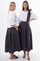 Брюки прямые, свободной формы со вставкой по боковому шву. В смещенном боковом шве расположены наклонные карманы. Спереди имитация застежки на гульфик. В боковые подрезы вставлены шнурки из основной ткани, которые при завязывании уменьшают ширину брюк. Верхний срез брюк обработан поясом с резинкой.