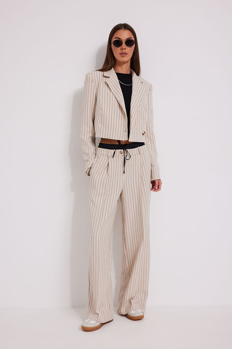 Комплект женский, состоящий из жакета на подкладке, брюк и топа из трикотажного полотна.