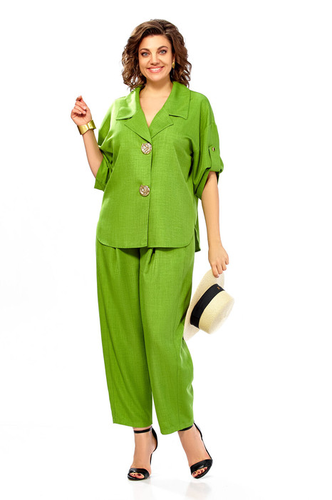 Шикарный костюм свободного силуэта. Застежка на две декоративные металлические кнопки. Воротник пиджачного типа. Рукав спущенный с патой, застегивающейся на пуговицу. Низ фигурной формы. Брюки свободные, зауженные к низу, с вертикальной вставкой вдоль бокового шва. По переду заложены односторонние складки. По спинке отрезная кокетка. Карманы в боковых швах. Верхний срез обработан притачным поясом.