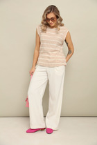 Летний комплект состоящий из жакета, брюк и блузы. Жакет прямого силуэта с пиджачным воротником, без подкладки и без застежки. По бокам накладные карманы с клапанами. На правом клапане декоративная нашивка. По талии кулиска. Рукава втачные, длиной три четверти с патами. Брюки прямые, зауженные к низу, с отворотом, пояс притачной на эластичной тесьме с кулиской, боковые карманы. Блуза прямого силуэта, рукав короткий.