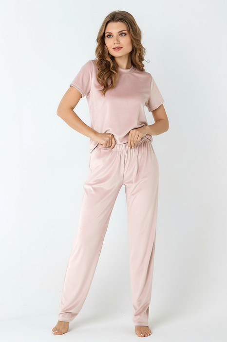 Костюм молодежный из трикотажного полотна «велюр-стрейч», состоящий из футболки и брюк. Футболка - классического покроя, с короткими втачными рукавами и горловиной овальной формы, обработанной втачной бейкой. Брюки – длинные, свободного покроя, с эластичной тесьмой по талии.