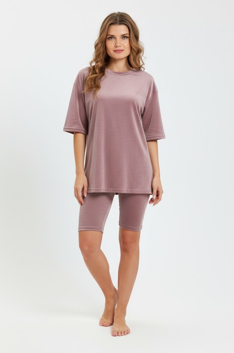 Костюм из гладкокрашеного трикотажного полотна «велюр стрейч», состоящий из футболки и леггинсов. Футболка – удлиненная, свободного покроя, со спущенной, линией плеча, короткими втачными рукавами, горловиной овальной формы, обработанной втачной планкой.Леггинсы – длиной до колен, с эластичной тесьмой по талии.
