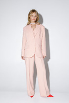 Текстильный костюм-двойка из классического двубортного жакета и прямых брюк-палаццо со стрелками.