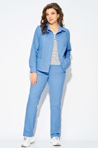 Длина жакета по спинке около 70 см в размерах 40-46 и около 73 см в размерах 48-52, длина рукавов около 62 см. Длина брюк по боковому шву с поясом около 112,5 в размерах 40-46 и около 114 см в размерах 48-52, длина по внутреннему шву около 80 см.