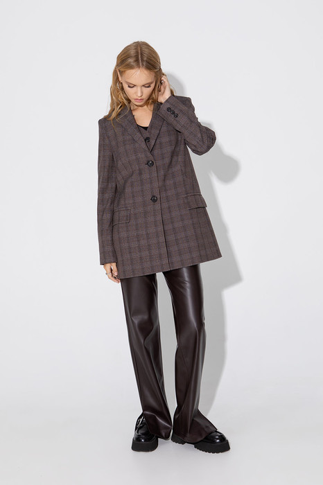 Комплект-двойка из трапециевидного жакета свободного покроя в клетку и прямых брюк из экокожи. Детали: пиджачный воротник, талиевые вытачки, перед с функциональным нагрудным и двумя прорезными карманами, застежка на пуговицы, спинка со средним швом и высокой шлицей, рукава втачные двухшовные, жакет на подкладке. Брюки с высокой посадкой, прилегающий силуэт, притачной пояс со шлевками, застежка на молнию и пуговицу, перед с боковыми карманами, спинка с кокеткой и двумя накладными карманами, разрезы по низу боковых швов. Изнанка экокожи с небольшим ворсом.