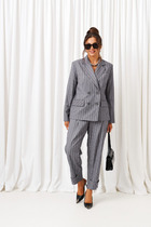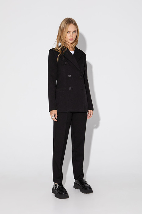 Классический костюм-двойка из двубортного жакета и укороченных брюк со стрелками.