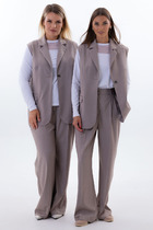 Костюм-двойка из укороченного оверсайз жакета с расширенными плечами и миди-юбки с разрезом. Детали: прямой силуэт, спущенная линия плеча, пиджачный воротник, перед с функциональным нагрудным карманом, застежка двубортная на петли и пуговицы, рукава втачные двухшовные, жакет на подкладке. Юбка асимметричного кроя с высоким разрезом по переду, притачной пояс со шлевками, застежка на молнию и пуговицу, боковые карманы.