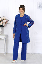 Длина жакета по спинке около 47 см в размерах 40-46 и около 49 см в размерах 48-52, длина рукава около 60см. Длина юбки по боковому шву с поясом около 98 см