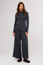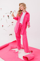 Костюм-двойка из укороченного оверсайз жакета с расширенными плечами и миди-юбки с разрезом. Детали: прямой силуэт, спущенная линия плеча, пиджачный воротник, перед с функциональным нагрудным карманом, застежка двубортная на петли и пуговицы, рукава втачные двухшовные, жакет на подкладке. Юбка асимметричного кроя с высоким разрезом по переду, притачной пояс со шлевками, застежка на молнию и пуговицу, боковые карманы.