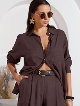 Свободная удлиненная блузка с карманом изо льна с вискозой