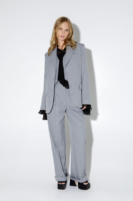 Костюм-двойка из оверсайз жакета и прямых широких брюк со стрелками из текстильной ткани. Детали: жакет прямого силуэта, расширенная линия плеч, пиджачный воротник, перед с прорезными функциональными карманами, однобортная застежка на петли и пуговицы, спинка со средним швом и шлицей, рукава втачные двухшовные, жакет на подкладке. Брюки с высокой посадкой на притачном поясе со шлевками, пояс прямой без резинки, застежка на молнию и пуговицу, боковые карманы, передние половины с заутюженными стрелками и двумя небольшими складками. Задние части брюк с вытачками и заутюженными стрелками.
