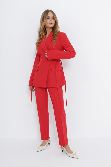 Детали: жакет полуприлегающего силуэта, рельефы, пиджачный воротник, застежка на две петли и пуговицы, функциональные карманы, жакет на подкладке. Жакет также можно зашнуровать по бокам. Брюки на притачном поясе со шлевками, застежка на молнию и пуговицу, боковые карманы, передние половины заутюженными стрелками. Задние части брюк с вытачками, стрелками и имитацией карманов. Низ брюк с широкой подгибкой, при помощи подгибки можно регулировать длину, подвернув её.