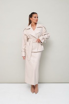 Детали: жакет свободного покроя, прямой силуэт, застежка на петли и пуговицы, функциональные карманы, жакет на подкладке. Юбка на притачном поясе, талиевые вытачки, застежка сзади на потайную молнию, юбка на подкладке.