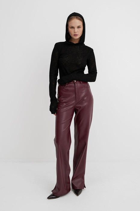 Комплект-двойка из базового лонгслива с капюшоном и прямых брюк из экокожи. Детали: лонгслив прямого силуэта, втачные удлиненные рукава. Перед и спинка удлиненные, что позволяет формировать драпировку по талии. Брюки с высокой посадкой, прилегающий силуэт, притачной пояс со шлевками, застежка на молнию и пуговицу, перед с боковыми карманами, спинка с кокеткой и двумя накладными карманами, разрезы по низу боковых швов. Изнанка экокожи с небольшим ворсом.