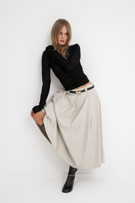 Комплект-двойка из трикотажного лонгслива с майкой и миди-юбки из экокожи.