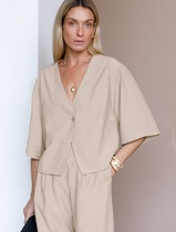 Текстильный костюм-двойка из свободного жакета и укороченных брюк с поясом-резинкой.