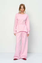 Трикотажный костюм-двойка из приталенного джемпера и свободных брюк.