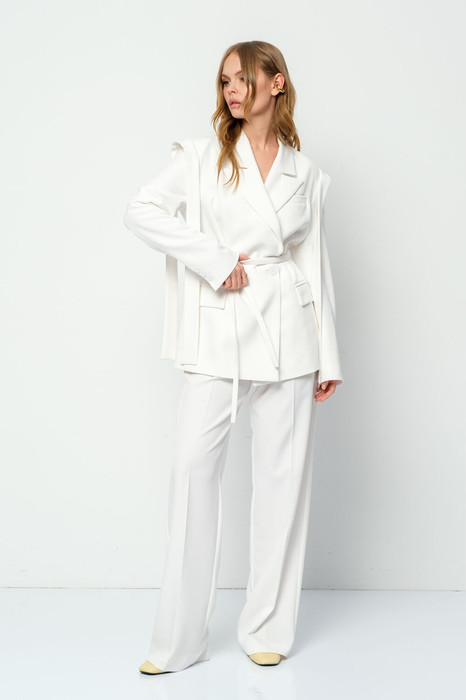 Детали: жакет свободного покроя и полуприлегающего силуэта, двубортная застежка на петли и пуговицы, отрезные бочки, пиджачный воротник, функциональные карманы, съемный пояс. Жакет на подкладке. Брюки с высокой посадкой, притачной пояс со шлевками, передние половины с небольшими застроченными мягкими складками и заутюженными стрелками, застежка на молнию и пуговицу, боковые карманы. Задние части брюк с вытачками и заутюженными стрелками. Пояс брюк прямой, без резинки.