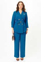 Текстильный костюм-двойка из приталенного жакета со съемным поясом и укороченных брюк со стрелками. Детали: пиджачный воротник, нагрудные вытачки, прорезные карманы с фигурными клапанами, рукава втачные со шлицей, жакет на подкладке; брюки со средней посадкой на притачном поясе, на передних половинах складки и заутюженные стрелки, застежка на молнию и пуговицу, боковые карманы.