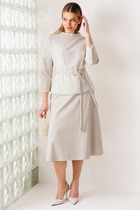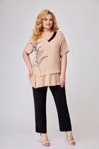 Текстильный костюм-двойка из приталенного жакета фурнитурой под золото и укороченных брюк со стрелками. Детали: пиджачный воротник, нагрудные вытачки, прорезные карманы с фигурными клапанами, рукава втачные со шлицей, съемный пояс, жакет на подкладке; брюки со средней посадкой на притачном поясе, на передних половинах складки и заутюженные стрелки, застежка на молнию и пуговицу, боковые карманы.