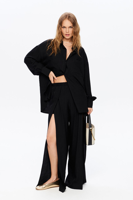 Костюм-двойка из свободной рубашки и широких брюк с высокими разрезами.