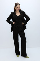 Костюм-двойка из приталенного жакета с акцентными плечами и асимметричной юбки со складками.