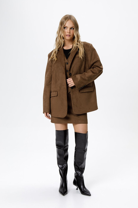 Костюм-тройка из оверсайз жакета, прямого жилета и мини-юбки из ткани под замшу.