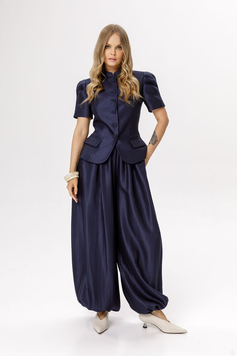 Детали: жакет прилегающего силуэта, рельефные швы, воротник-стойка, застежка на петли и пуговицы, рукава короткие со складками по окату, жакет на подкладке. Брюки О-силуэта, притачной пояс, пояс и манжеты по низу на резинке, карманы в боковых швах.