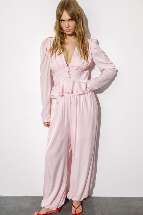 Костюм-двойка из блузы с воланами и широких свободных брюк-алладинов.
