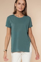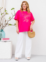 Костюм женский состоящий из блузы и брюк. Блуза свободного силуэта с центральной застежкой на петли пуговицы. Рукав цельнокроеный широкий, длиной от горловины 51 см. Воротник стояче-отложной. По боковым швам расположены 2 разреза. Брюки свободного силуэта, широкие без бокового шва. Верх брюк на подкладке с цельнокроеным поясом на резинке. Длина изделия – 79 см, длина брюк по боку – 120 см