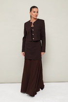 Жакет полуприлегающего силуэта, с центральной застежкой на петли и пуговицы. Воротник пиджачного типа с отложными лацканами, край борта скругленный по низу жакета. Спереди прорезной карман в рамку с клапаном. По правой полочке обработан декоративный элемент в виде настрочных воланов. Рукава втачные, двухшовные с вытачными шлицами с пуговицами. Спинка с рельефами и средним швом, переходящим в шлицу. Жакет на подкладке.