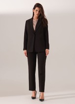 Жакет прилегающего силуэта, слегка расширенный к низу. Горловина с цельнокроеной стойкой и V-образным вырезом. Центральная застёжка на потайные пришивные кнопки с декоративными акцентными пуговицами. Рукава втачные, двухшовные. Спинка с рельефами и средним швом.
