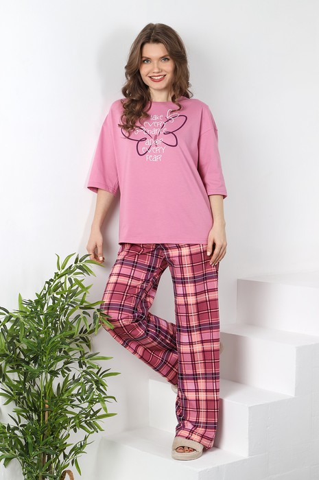 Костюм молодежный из трикотажного полотна «кулирка» в комбинации двух видов: с набивным рисунком и гладкокрашеного в единой цветовой гамме, состоящий из футболки и брюк. Футболка - из гладкокрашеного полотна, классического покроя, с короткими втачными рукавами, горловиной овальной формы и принтом на полочке, выполненным в технике «шелкографии». Горловина обработана притачной бейкой из основного материала.Брюки - из полотна с набивным рисунком, длинные, слегка расширенные книзу, с карманами в боковых швах, на притачном поясе с эластичной тесьмой внутри.