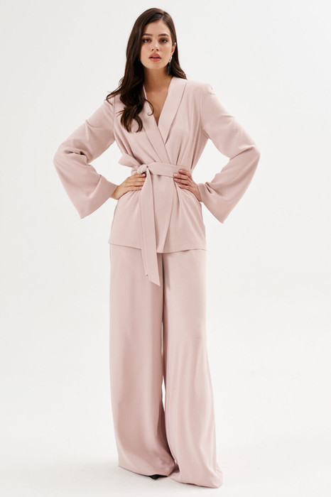 Жакет прямого силуэта, длиной ниже линии бедер. Рукава одношовные, втачные, длинные. По низу рукава «клеш». Воротник «шаль». Жакет без застежки со съемным поясом, без подкладки.
