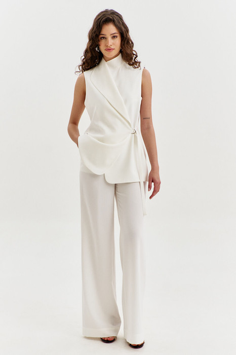 Комплект, состоящий из жилета и брюк. Жилет свободного кроя, длиной чуть ниже бедер. Спинка со средним швом. Перед ассиметричный: правый перед с воротником «апаш», левый перед с воротником стойка. Застежка двубортная на пояс с полукольцами. Жилет на подкладке. Брюки прямого силуэта, на притачном поясе с резинкой по спинке. По задним половинкам талиевые вытачки. По передним половинкам обработаны боковые карманы с наклонным входом, и застежка на тесьму-«молнию» с гульфиком и откоском. По поясу застежка на петлю и пуговицу