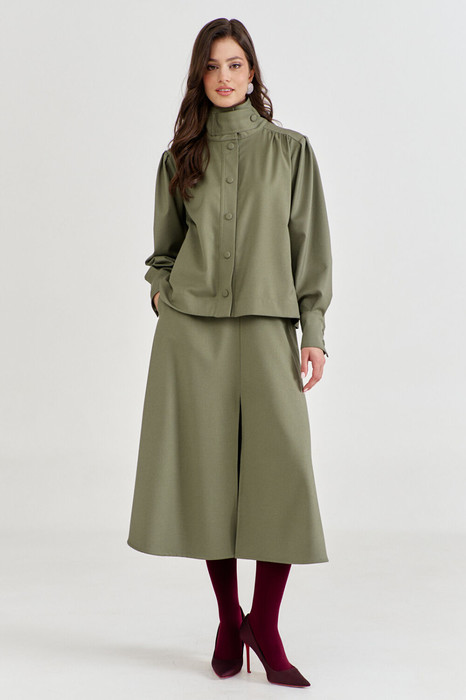 Комплект, состоящий из блузона и юбки. Блузон свободного кроя, длиной выше бедер. По спинке кокетка, переходящая на перед. По шву притачивания кокетки частичная сборка. По переду обработаны прорезные карманы «в рамку». По шву притачивания кокетки выполнена сборка. Рукава одношовные, втачные, длинные. По окату рукава заложены складки. По низу рукава заложены складки, разрез и притачная манжета. Разрез  обработан цельнокроеной планкой. По манжете застежка на кнопки. По горловине воротник стойка. По воротнику настрочена пата. Застежка по переду на кнопки на притачной планке. Юбка А-образного силуэта, длиной до середины икры. Заднее полотнище со средним швом, в котором обработана застежка на потайную тесьму-«молнию». Переднее полотнище со средним швом, в котором обработан разрез. Юбка на притачном поясе-обтачке.