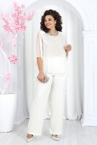 Комплект, состоящий из жилетки, топа и брюк. Жилетка свободного кроя, длиной выше колена. Спинка со средним швом, в котором обработан разрез. Перед с нагрудной вытачкой. Пройма глубокая, квадратной формы. Воротник пиджачного типа со стойкой. Жилетку дополняет шифон по спинке и переду. Жилетка без застежки на подкладке. Топ на бретелях, двойной, длиной выше бедер, с неровной линией низа (спинка удлинена). По переду топа нагрудные вытачки. Брюки длинные, широкие, на притачном поясе с резинкой. По спинке талиевые вытачки. По переду, с правой стороны, вставлена деталь из шифона, выполнена в виде запаха, которая крепится с левой стороны при помощи пояска и паты с полукольцами. В боковых швах обработаны карманы.