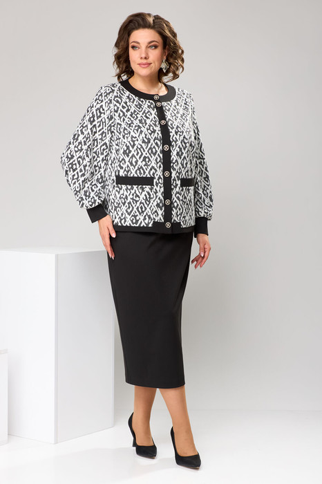 Костюм женский, предназначен для повседневной носки. Костюм женский 2-х предметный жакет и юбка. Жакет прямого силуэта, длиной до линии бёдер. Перед с 2-мя нагрудными вытачками, с 2-мя накладными прямоугольными карманами с притачной обточкой из отделочной ткани вверху; с приточными планками по горловине и краю борта из отделочной ткани. Спинка цельнокроеная. Жакет с притачной планкой по низу из отделочной ткани. Горловина круглая обточная, без воротника. Застёжка центральная, бортовая на 7-мь обмётанных петель и 7-мь пришивных пуговиц. Рукав втачной, одно шовный, длинный, внизу со встречной складкой и лёгкой сборкой, с притачной манжетой из отделочной ткани. Перед и спинка жакета на подкладке. Жакет с плечевыми накладками. Юбка женская карандаш, длиной до нижней части икры. Переднее полотнище цельнокроеное. Заднее полотнище с 2-мя таллиевыми вытачками и средним швом, заканчивающимся разрезом. Юбка с притачным поясом, собранным на эластичную тесьму. Юбка на подкладке. Длина спинки жакета 62 см, длина рукава 61,5 см. Длина юбки по боковому срезу 83 см.