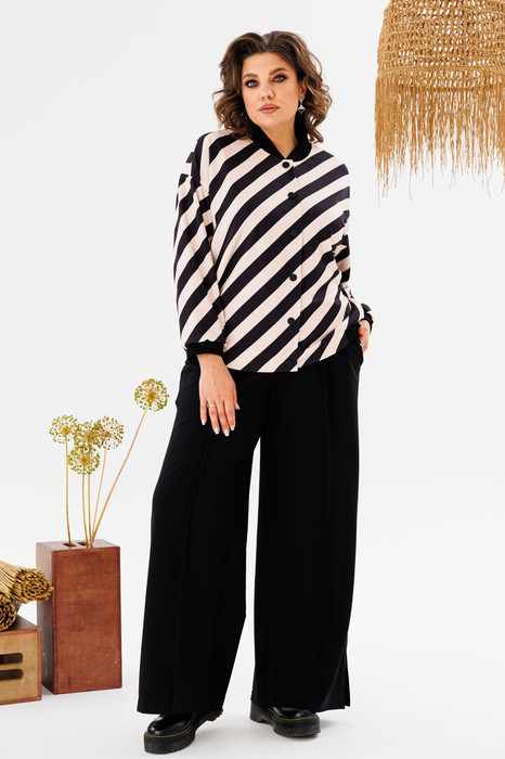 Костюм женский предназначен для повседневной носки. Костюм женский 2-х предметный жакет и брюки. Жакет женский прямого силуэта, длиной до линии бёдер. Перед и спинка без конструктивных особенностей. В боковых швах обработаны карманы. Горловина круглая с втачной стойкой из отделочной ткани. Застёжка центральная бортовая на 6-ть пробивных металлических кнопок. Жакет со спущенным плечом. Рукав втачной, длинный, одно шовный, с притачной манжетой из отделочной ткани. Низ жакета с втачным планками (по бокам) из отделочной ткани. Жакет на притачной подкладке. Жакет без плечевых накладок. Брюки женские прямые длинные. Передние половинки с карманами в боковых швах с декоративными защипами по центру, шириной 0,5 см. Задние половинки с таллиевыми вытачками. Боковые швы с разрезами. Брюки с притачным поясом, собранным на эластичную тесьму, закреплённую 2-мя отделочными строчками. Длина спинки жакета 65 см, длина рукава от плеча 68 см. Длина брюк по боковому срезу 103 см.