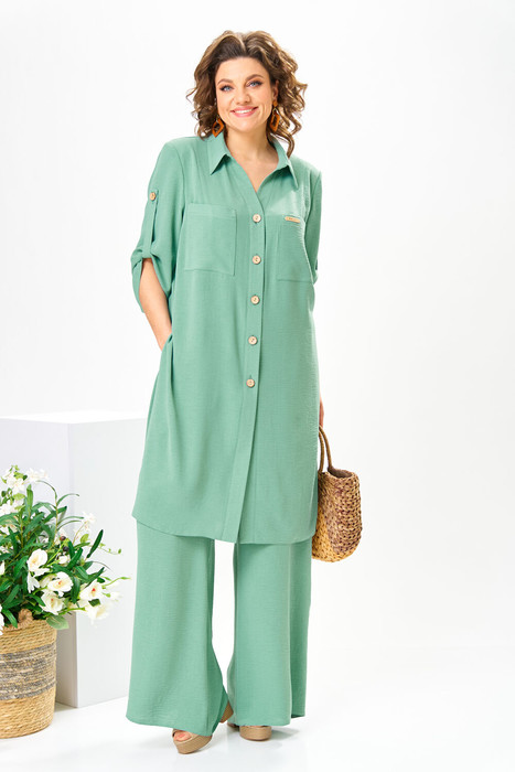 Костюм женский, предназначен для повседневной носки. Костюм женский, 2-х предметный блузка и брюки. Блузка женская, удлинённая прямого силуэта, длиной до середины колена. Перед с 25-мя нагрудными вытачками, выходящими из плечевых швов, с 2-мя накладными прямоугольными карманами на уровне груди, левый декорирован пришивным украшением, с 2-мя притачными вертикальными планками по горловине и краю борта. Спинка с отрезной кокеткой и встречной складкой по центру. Горловина с V-образным фигурным вырезом с втачным воротником рубашечного типа с отрезной стойкой. Застёжка центральная на 5-ть вертикально-обмётанных петель и 5-ть пришивных пуговиц. Боковые швы с высокими разрезами. Рукав втачной одно шовный длиной 7/8 с патой, фиксирующейся на пришивную пуговицу и регулирующей длину рукава. Блузка с плечевыми накладками. Брюки женские прямые широкие длинные. Передние половинки с карманами в боковых швах с отрезными бочками. Задние половинки с таллиевыми вытачками. Брюки с притачным поясом, собранным на эластичную тесьму, закреплённую 2-мя отделочными строчками. Длина брюк по боковому срезу 106 см. Длина спинки туники 100 см, длина рукава 50 см.