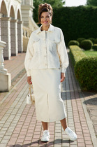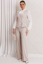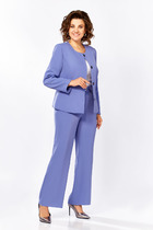 Комплект женский предназначен для повседневной носки. Комплект женский 3-х предметный, жилет, блузка и брюки. Жилет прямого силуэта, длиной ниже линии бёдер на 15 см. Перед с 2-мя нагрудными вытачками, выходящими из плечевых швов, с прорезным карманом с клапаном и 2-мя обтачками на правой части. Спинка со средним швом, заканчивающимся шлицей. Горловина с V-образным вырезом. Застёжка 2-х бортная на потайную петлю и пуговицу и на пояс, закреплённый на уровне линии талии и металлическую пряжку. Проймы обтачные. Жилет на притачной подкладке. Блузка женская прямого силуэта, длиной ниже линии бёдер на 5 см. Перед с 2-мя нагрудными вытачками. Спинка цельнокроеная. Горловина круглая с втачной планкой. Рукав втачной, короткий, одно шовный. Блузка без плечевых накладок. Брюки женские слегка заужены к низу, длиной 7/8. Передние половинки с односторонними складками и карманами в боковых швах, с отрезными бочками. Задние половинки с таллиевыми вытачками. Застёжка центральная на потайную тесьму-молнию. Брюки с притачным поясом, частично собранным на эластичную тесьму, с застёжкой на 1-ну горизонтальную обмётанную петлю и 1-ну пришивную пуговицу. Низ брюк с отложной манжетой, закреплённой по боковому шву. Длина спинки жакета 74,5 см. Длина брюк по боковому срезу 98 см. Длина спинки блузки 63 см, длина рукава 25,5 см.