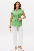 Комплект, состоящий из жакета и шорт из легкой костюмной ткани на подкладке. Двубортный жакет выполнен в стиле оверсайз. Воротник-с отложными лацканами пиджачного типа, рукава – двухшовные. Карманы в боковых швах. Жакет застегивается на две основные пуговицы, одну потайную, остальные пуговицы несут декоративный характер. Шорты с наклонными боковыми карманами и широким поясом-обтачкой. Застегиваются на молнию по переду и пуговицу.