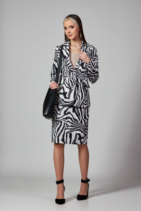 Комплект из костюмной ткани на подкладке, состоящий из жакета и юбки. Жакет приталенного силуэта с прорезными карманами с клапанами по переду. Воротник-английский, рукава - двухшовные. Кант по краю борта, клапанам добавляет стиля и элегантности. Застегивается на две пуговицы. Юбка на подкладке, слегка зауженная к низу, без пояса. Верх юбки обработан обтачкой. Шлица в среднем шве заднего полотнища юбки обеспечит свободу движения. Застежка - молния в среднем шве юбки.