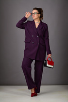 Брючный комплект из костюмной ткани на подкладке. Двубортный жакет выполнен в стиле оверсайз. Воротник-с отложными лацканами пиджачного типа, рукава - двухшовные. Карманы в боковых швах. Жакет застегивается на две основные пуговицы. Брюки слегка заужены к низу, с двумя наклонными карманами и притачным поясом. Застегиваются на молнию по переду и одну пуговицу.