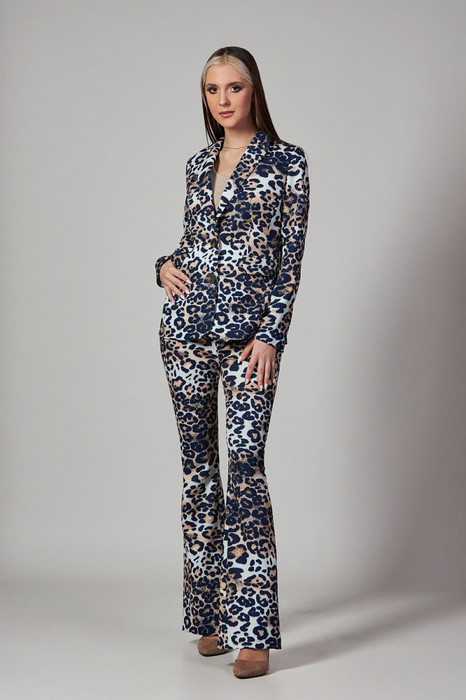Классический брючный комплект из костюмной ткани на подкладке. Жакет приталенного силуэта с прорезными карманами с клапанами по переду. Воротник-английский, рукава - двухшовные.    Брюки-клеш  расширены к низу, с началом расширения выше колена 5 см. Брюки с двумя  карманами округлой формы  и поясом-обтачкой.  Застегиваются на молнию по переду и  одну пуговицу.