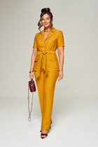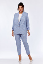 Брючный комплект из костюмной ткани на подкладке. Двубортный жакет выполнен в стиле оверсайз. Воротник-с отложными лацканами пиджачного типа, рукава – двухшовные. По переду- прорезные карманы с клапанами. Жакет имеет два ряда пуговиц, застегивается на две основные пуговицы, одну потайную, остальные пуговицы несут декоративный характер. Брюки прямые со складкой, широким поясом-обтачкой, наклонными карманами. Застегиваются на молнию по переду и пуговицу.