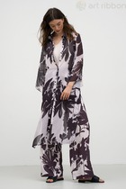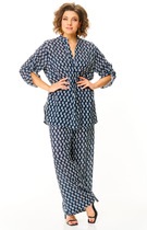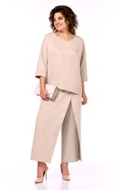 Брючный комплект из костюмной ткани на подкладке. Двубортный жакет выполнен в стиле оверсайз.  Воротник-с отложными лацканами пиджачного типа, рукава - двухшовные. По переду- прорезные карманы  с клапанами. Жакет имеет  два ряда пуговиц, застегивается на две основные пуговицы, одну потайную, остальные пуговицы несут декоративный характер.  Брюки-клеш  расширены к низу, с началом расширения выше колена 5 см. Брюки с двумя карманами и поясом-обтачкой.  Застегиваются на молнию по переду и  одну пуговицу.