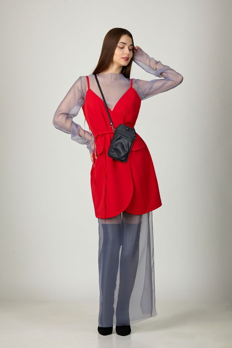 Комплект женский, состоящий из верхнего платья из плательно-костюмной ткани на подкладке и нижнего платья из прозрачной вуали.