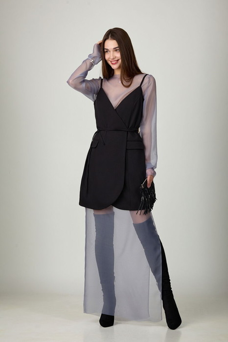 Комплект женский, состоящий из верхнего платья из  плательно-костюмной ткани на подкладке и нижнего платья из прозрачной вуали.