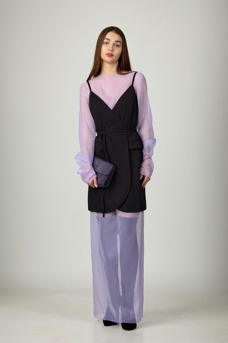 Комплект женский, состоящий из верхнего платья из плательно-костюмной ткани на подкладке и нижнего платья из прозрачной вуали.